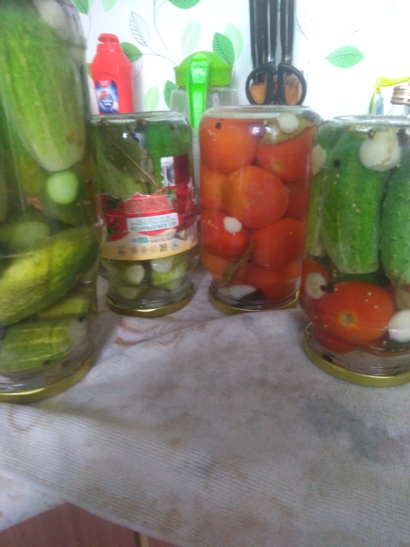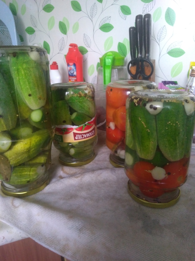 Вода у нас вскипела, залила банки кипятком и закрыла крышками на 5-10 минут. Затем поставила снова 2,5л воды кипятиться для маринада : сразу добавила сахар 7 ст.ложек и соль 5 ст.ложек. Слила воду из банок, снова закрыв их крышками, чтобы тепло не ушло. В закипевшую воду потихоньку влила уксус 70% 2 ст.ложки и залила в банки, потом закрутила и перевернула до полного остывания. Огурцы поменяют цвет, это так надо из-за уксуса. Вкус получается кисло-сладкий, но не приторный сладкий, и не кислый, очень вкусные помидоры и хрустящие огурцы. Хранить можно как холодильнике, так и в погребе. У меня вначале стоят в холодильнике, потом спускаю в подвал на полку.
