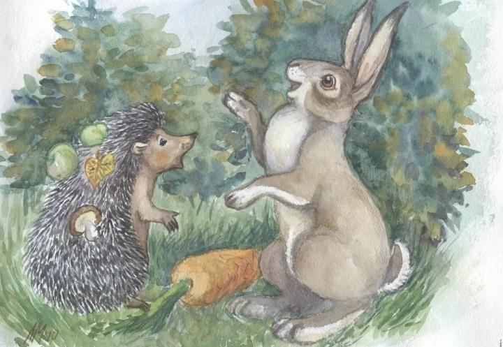 Один раз ежик говорит зайчику: " У меня идея! Давай-ка так: ты собираешь мне яблоки и груши, а я тебе - морковку и капусту."
