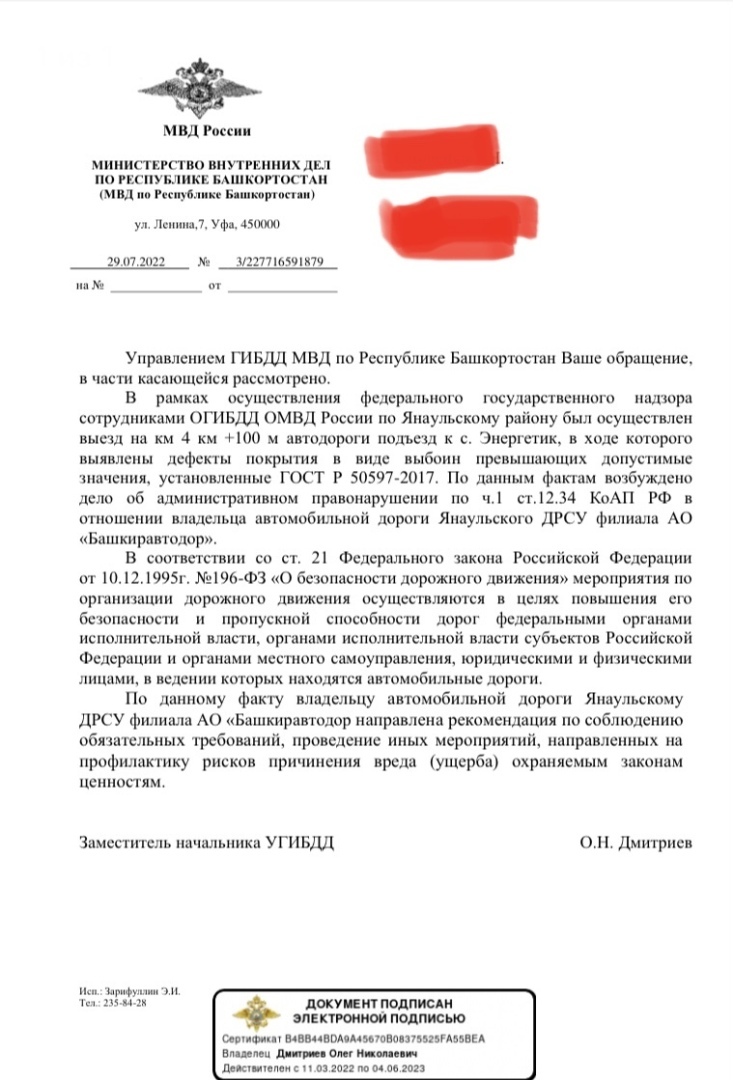 В связи с этим я обратился по данной проблеме в отдел главного управления ГИБДД РФ, который занимается непосредственно разбитыми дорогами, и в Правительство Республики Башкортостан, откуда в свою очередь переслали мои претензии в нижестоящие ведомства этого региона.