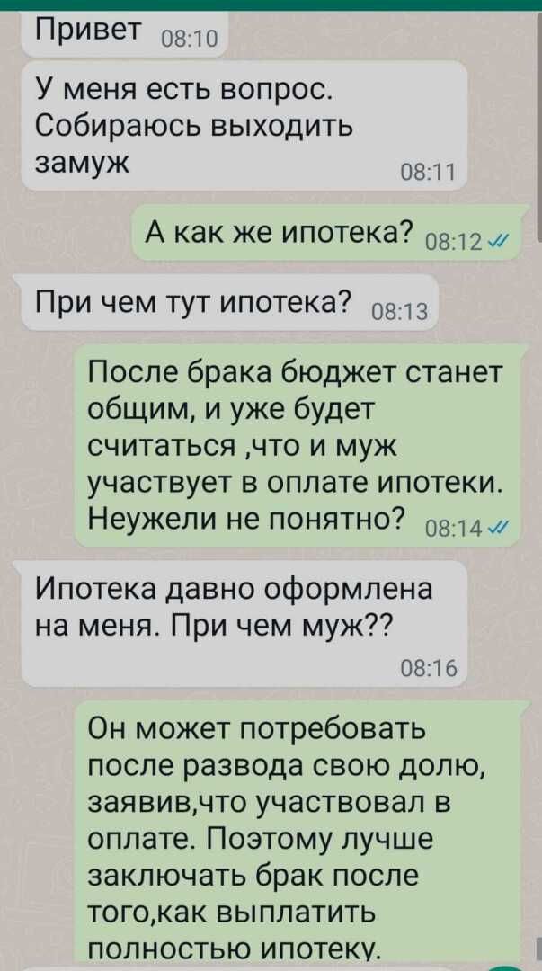 Моя знакомая платит ипотеку уже 14 лет. Через год должна выплатить последний платёж – и всё, у неё будет собственная квартира. Хотя большую часть она уже выплатила, но... если выйдет замуж, то бюджет уже станет общим независимо, кто платит ипотеку.