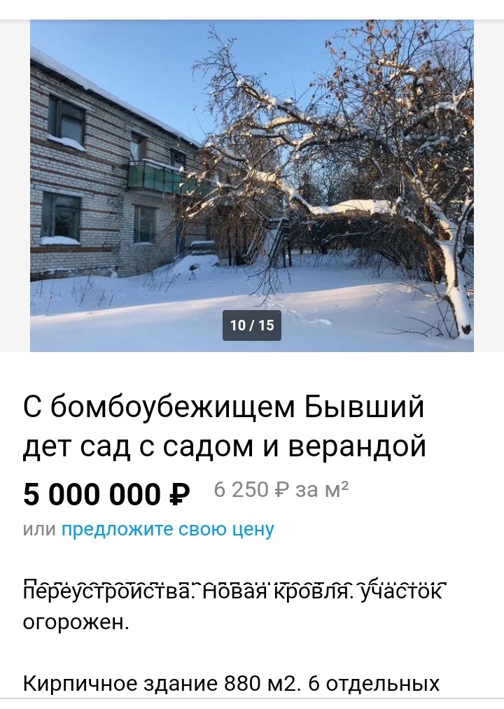В том же Белгороде фирма предлагает и адресные бомбоубежища. Продают адресное бомбоубежище, к примеру, и в Чувашии. Но там оно идёт как дополнение к зданию бывшего детского сада и обойдётся в 5 миллионов рублей.