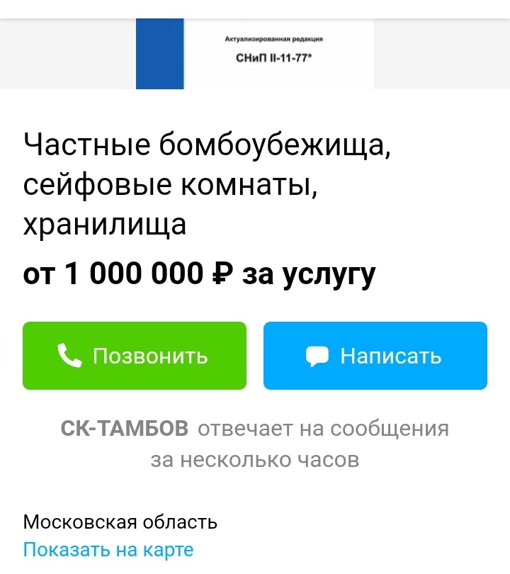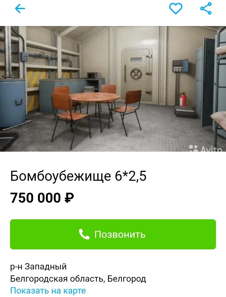 Смотрел – и тут как-то случайно увидел рекламу бомбоубежищ. И как оказалось, что объявлений по этому поводу, в общем, хватает. Стоимость начинается где-то с 750 000 рублей. Так, например, в Белгородской области в такую сумму обойдется помещение 6 метров на 2,5.
