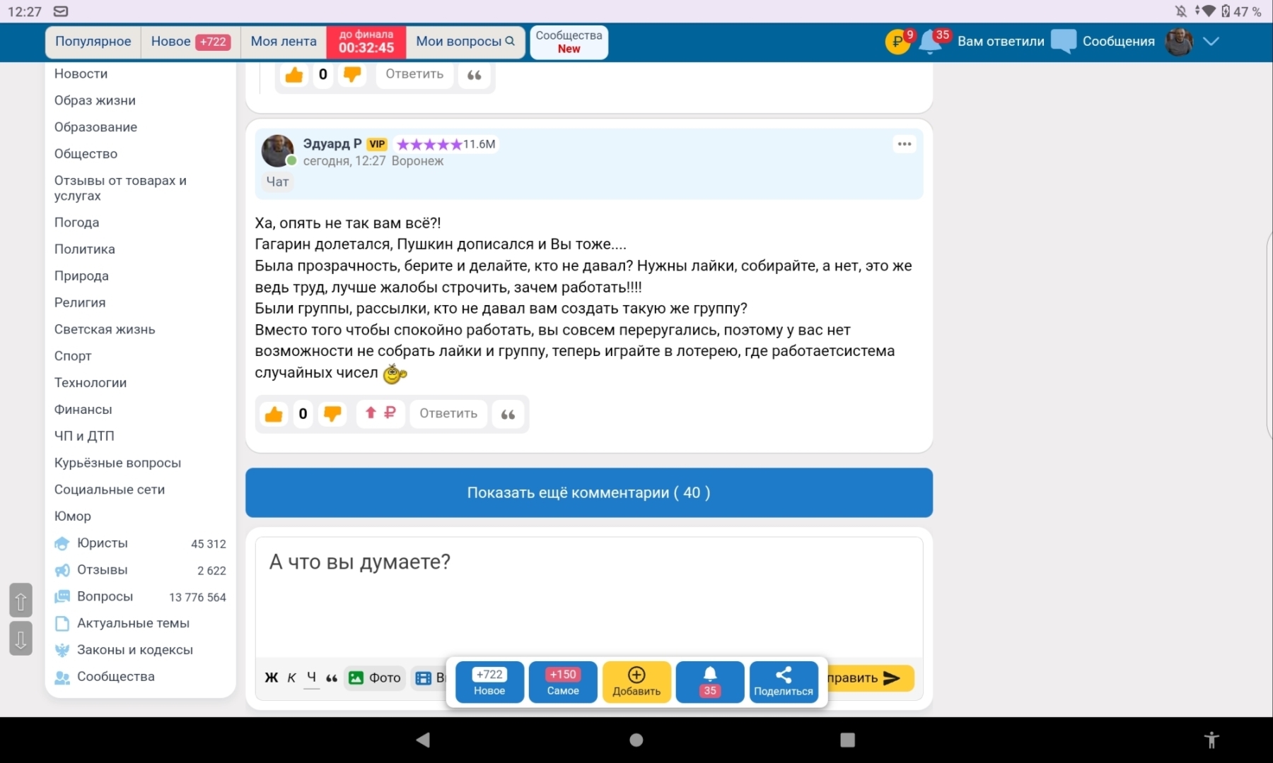 Давайте тогда всех обсуждать. У вас тоже статьи с веселыми картинками 2 месяца в топе были. Целый день сидеть и лайки крутить это норм, а вот у юристов такого права не было. Мы в отличии от вас не можем всем подряд писать. Чего кривить душою я админам предложил уровнять шансы, конечно может это не только мои слова на это решение повлияли, но хотя бы шансы уровняли.