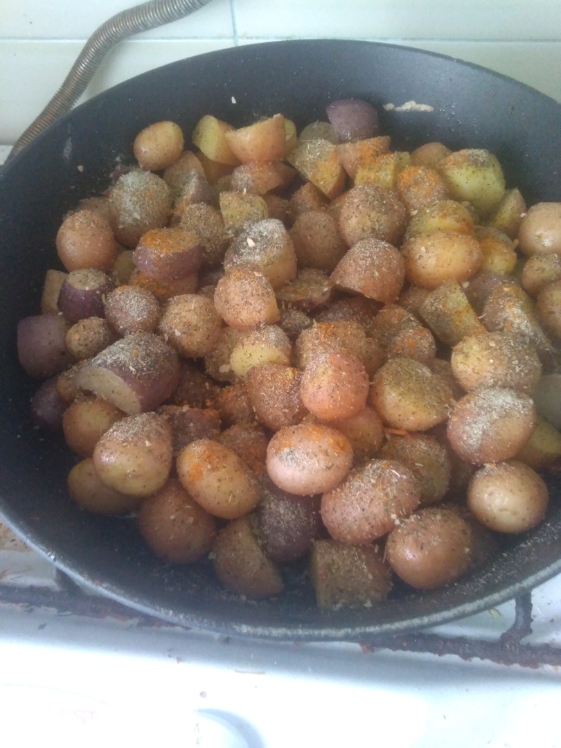 Берем мелкую картошку, хорошенько моем, но кожицу не снимаем, весь смак в ней. Затем, на разогретую сковороду наливаем масло растительное, можно сливочное( вкуснее будет) и выкладываем чуть подсоленую картошку под крышку на 10 минут. Через это время, посыпаем любой готовой приправой и оставляем на плите до полной готовности. Перемешиваем, и ву-а-ля, вкуснота готова...👍