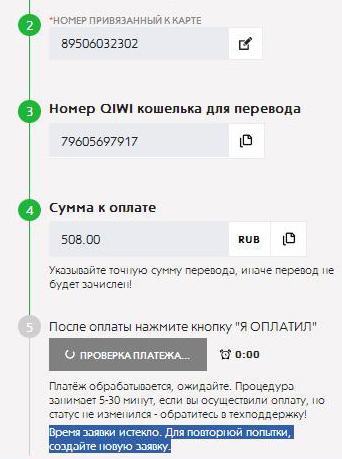 А "Платёж обрабатывается, ожидайте. Процедура занимает 5-30 минут, если вы осуществили оплату, но статус не изменился - обратитесь в техподдержку!"....