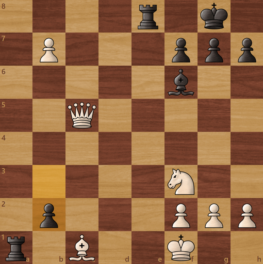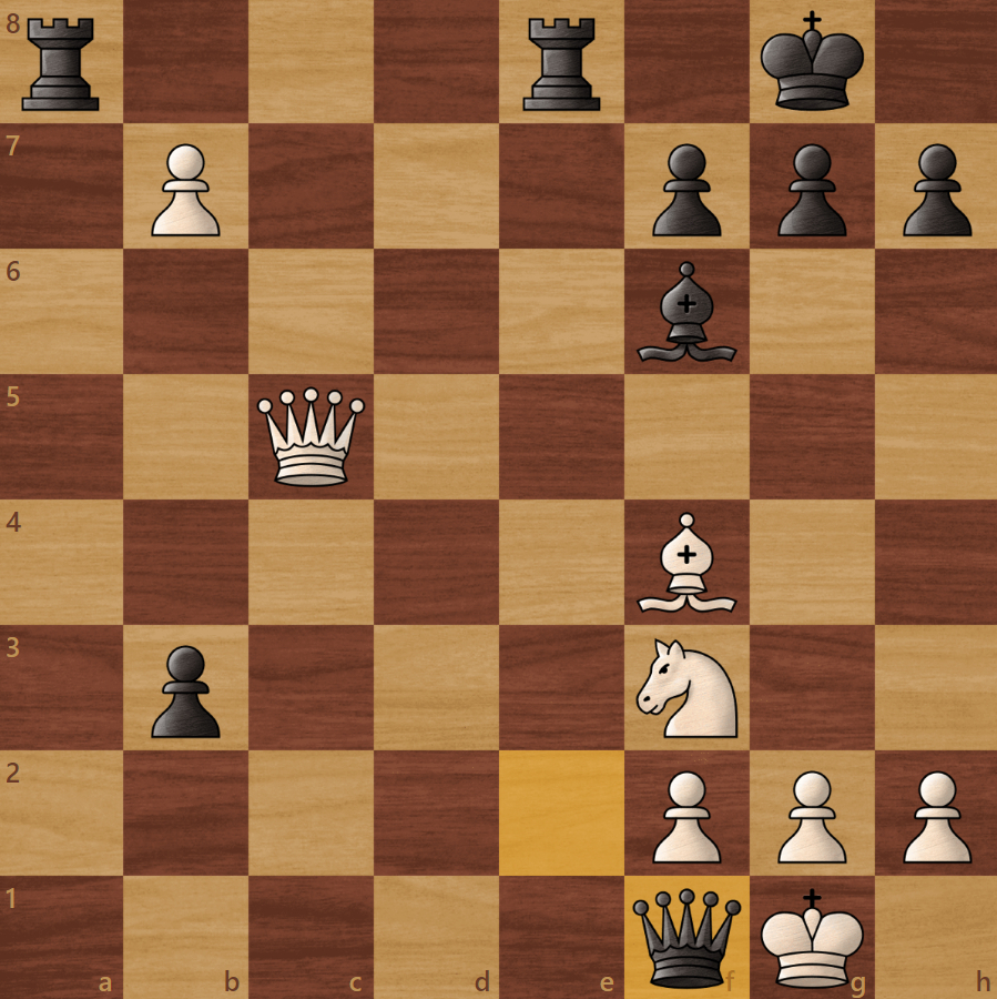 После этого хода будущего чемпиона мира немецкий шахматист сдался, так как белые в ближайшие несколько ходов теряют ферзя и слона: