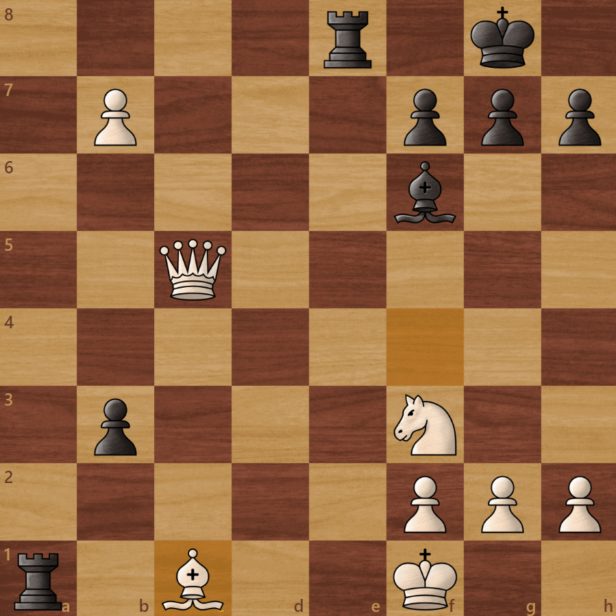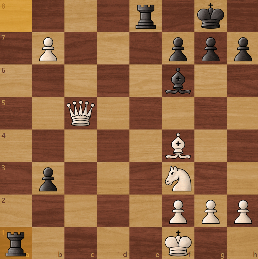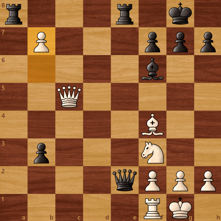 Белые допускают ошибку, сыграв b7. Найдите то, как сыграл Алехин и выиграл партию: