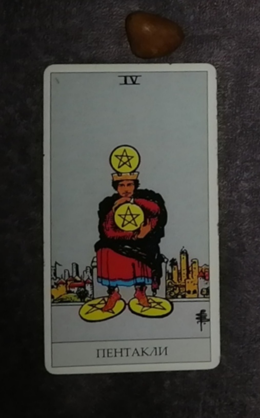 карта 1, "Четвёрка Пентаклей". Масть Пентаклей. Стихия земля. Всегда связаны с материальным миром, стабильностью и надёжностью. Значение карты: стабильность, финансовое благополучие, скупость, уверенность, защищённость.