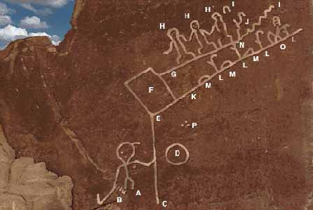 Большая человеческая фигура слева – это Великий Дух. Лук в его левой руке символизирует его указания хопи сложить оружие. Вертикальная линия справа от Великого Духа – это временная шкала в тысячи лет. Точка, в которой великий Дух касается линии, является временем его возвращения.