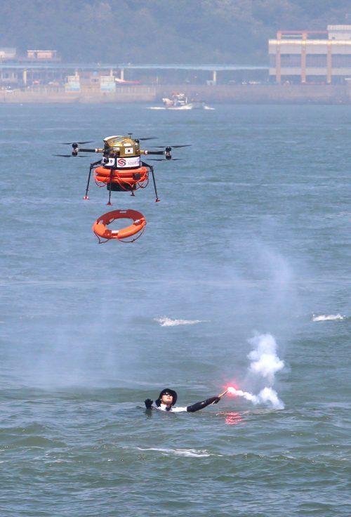 Вот тут на помощь и может прийти такой своеобразный водный дрон. Такой спасательный круг создали в Гонконге, разгоняется до 15 км/час, отплывает от пульта дистанционного управления на 500 метров, время работы 30 минут. Передвигается даже при сильной волне.