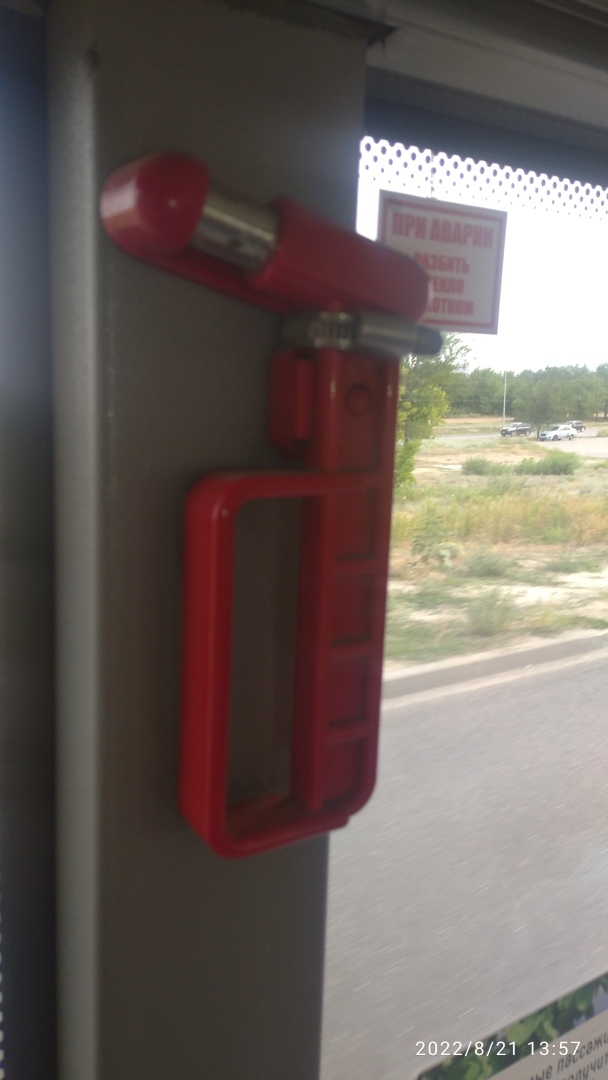 Доброго дня всем пользователям сайта. Сегодня, воспользовался услугами общественного транспорта города-героя Волгограда чтобы доехать до автовокзала. По чистой случайности свободное место было возле аварийного окна. Сразу бросилась в глаза интересная деталь, молоток для того чтобы разбить стекло при аварии фактически есть, но воспользоваться им даже в обычной спокойной обстановке без инструментов ( в данном случае отвёртки) невозможно. Мы каждый день пользуемся общественным транспортом и не задумываемся о таких мелочах. На такие мелочи обычно обращают внимание только если что-то происходит. Ситуацию на фото нельзя назвать случайностью - здесь явно осознанные действия сотрудников автопредприятия, направленные против безопасности пассажиров.
