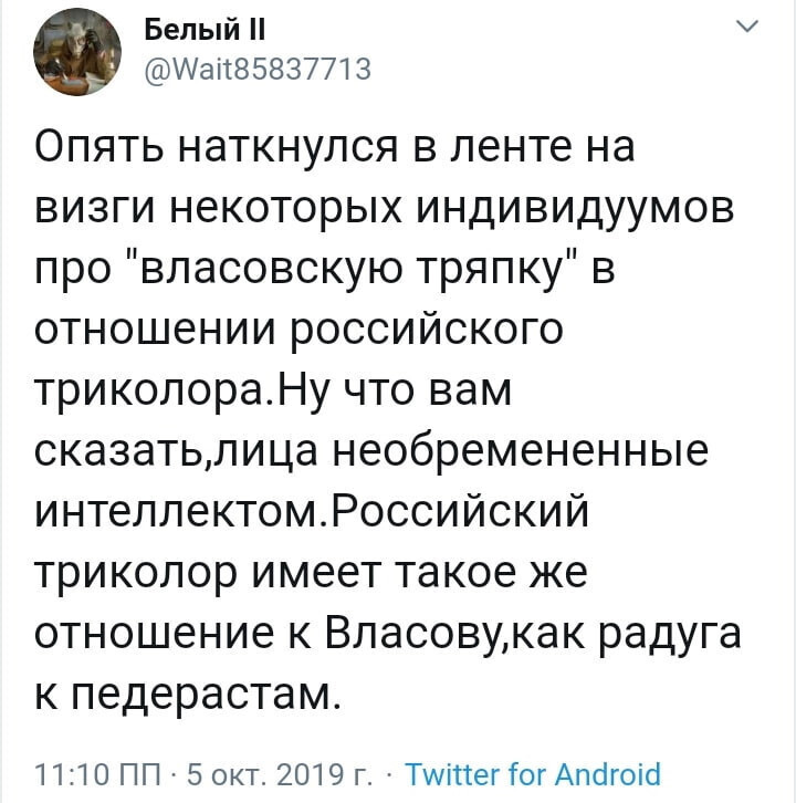 Шизик диванный.. Я за власова дизлайк ставил да ? Ты назвал государственный флаг флагом власова, а это оскорбление власти. Угомонись пока не поздно. И заставь свои пальчики перестать печатать всякую херню