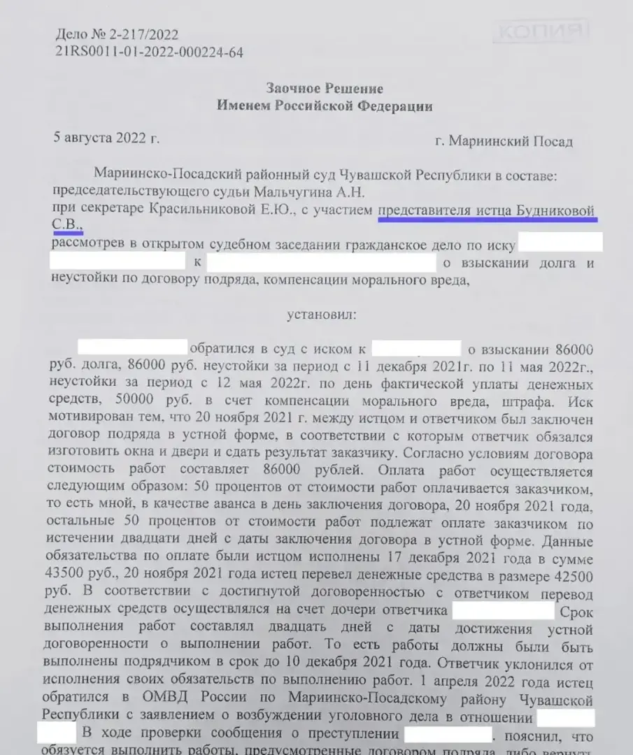 Один предприниматель обещал поставить окна и двери и установить их. Получил 86 тысяч рублей. Заказ не выполнил. Деньги не вернул. Обращение в полицию не помогло. Зато помог суд, даже несмотря на то, что договоренность была устная и деньги переводились на карту дочери предпринимателя.