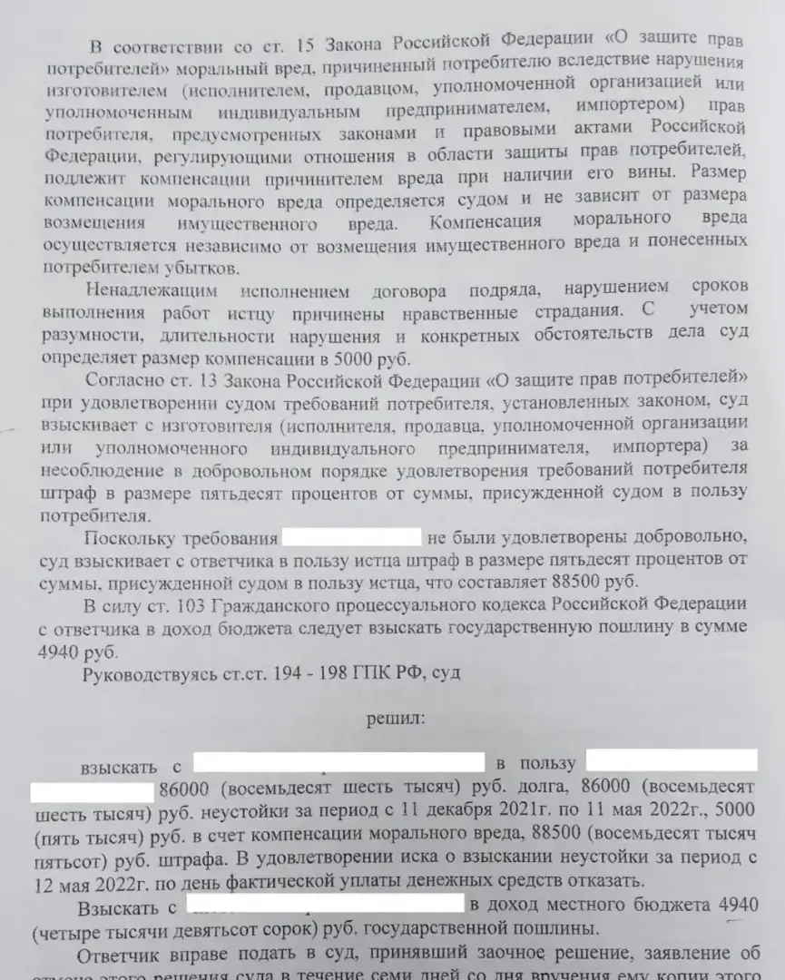 В результате взысканы эти 86 тысяч рублей, еще 86 тысяч рублей в качестве неустойки, еще столько же штраф за нарушение прав потребителей и 5 тыс. рублей в качестве компенсации морального вреда. Вышло в 3 раза больше, чем мог бы вернуть.