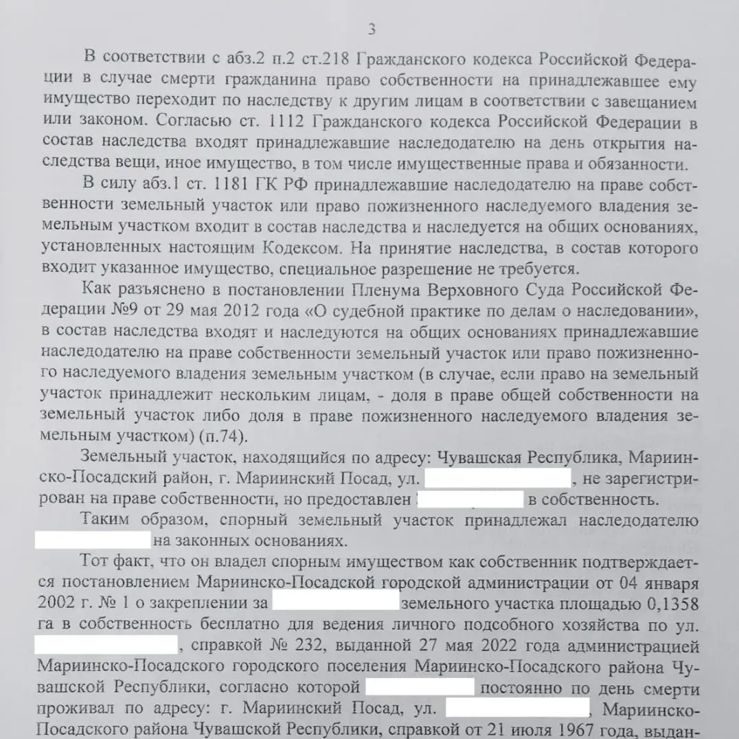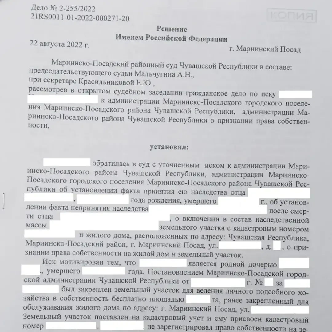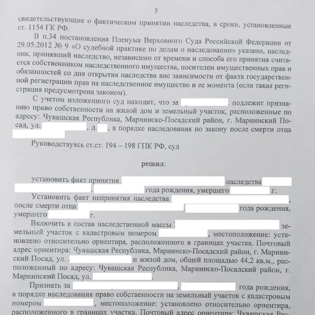 Решением суда признано право собственности доверителя на дом и земельный участок.