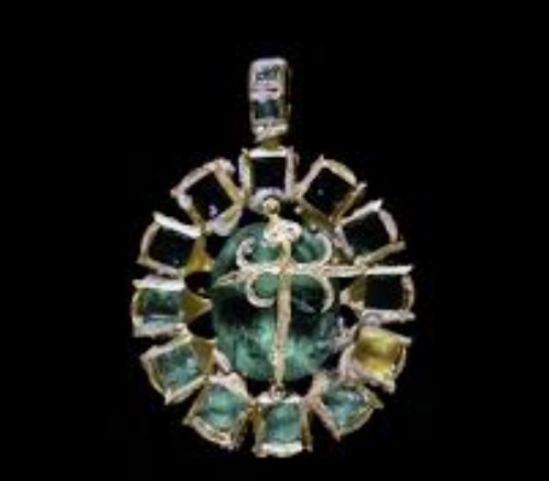 Ещё нашли несколько золотых подвесок с крестом Сантьяго — украшение рыцарей одноимённого священного ордена. Одна из них была инкрустирована 12 изумрудами.