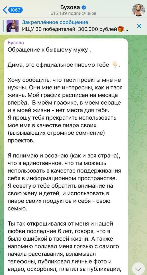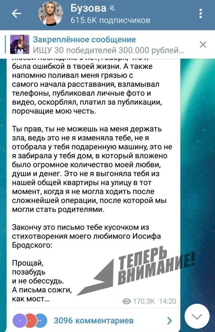 А сегодня Бузова решила публично ответить бывшему мужу. Она опубликовала послание в своем Telegram-канале.