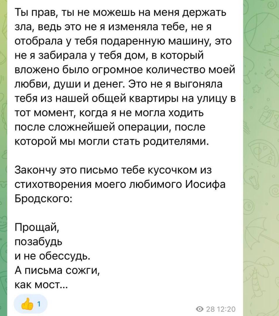 Ты так открещивался от меня и нашей любви последние 6 лет, говоря, что я была ошибкой в твоей жизни. А также напомню поливал меня грязью с самого начала расставания, взламывал телефоны, публиковал личные фото и видео, оскорблял, платил за публикации, порочащие мою честь. Ты прав, ты не можешь на меня держать зла, ведь это не я изменяла тебе, не я отобрала у тебя подаренную машину, это не я забирала у тебя дом, в который вложено было огромное количество моей любви, души и денег. Это не я выгоняла тебя из нашей общей квартиры на улицу в тот момент, когда я не могла ходить после сложнейшей операции, после которой мы могли стать родителями»-написала звезда.