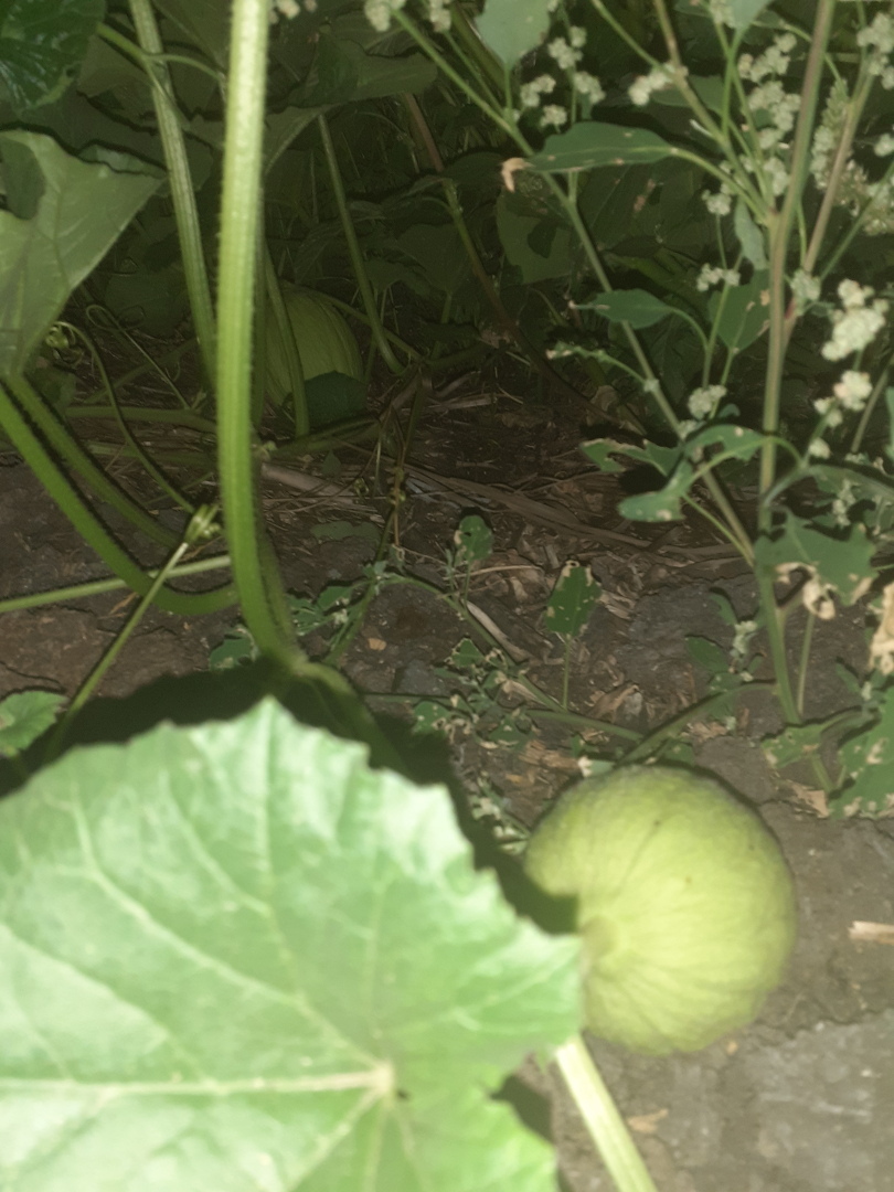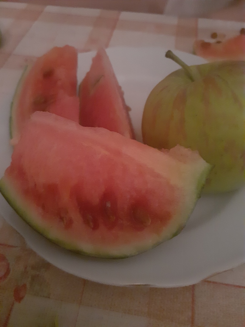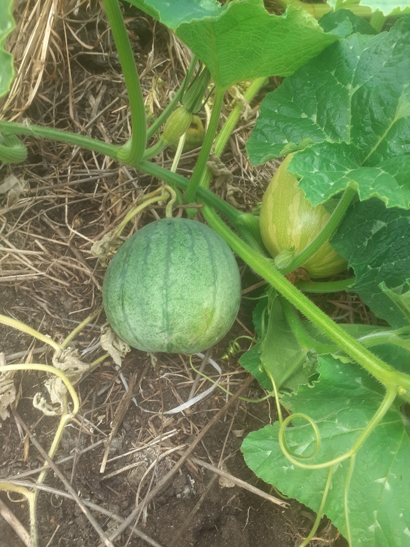 Яблоко -небольшое. А арбуз маленький конечно- по сорту.А вот дынька вряд ли вырастет и поспеет -в субботу значительное похоладание