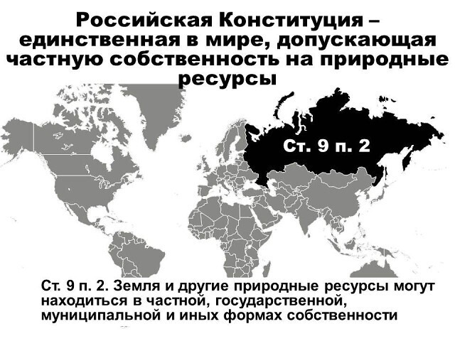 Наверное, Россия единственная страна в Конституции которой прописана частная собственность на землю и её недра....