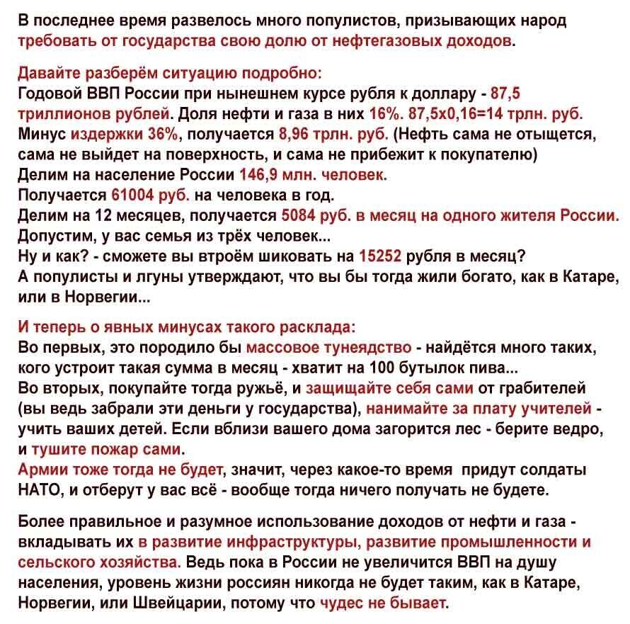 Если бы эти 40% богатств находились в одном районе, а страна не занимала одну шестую часть света и не надо бы строить дороги, трубопроводы, железные дороги и дома из прочных материалов, а не как например в США из фанеры, то тогда бы жили, как в Кувейте. А так за вычетом на всё это и на функционирование государства остаётся 30тыс. в год доходов на человека, уже давно всё подсчитано. Как говориться, никогда не было, и вот опять. Чистейший популизм, а не статья.