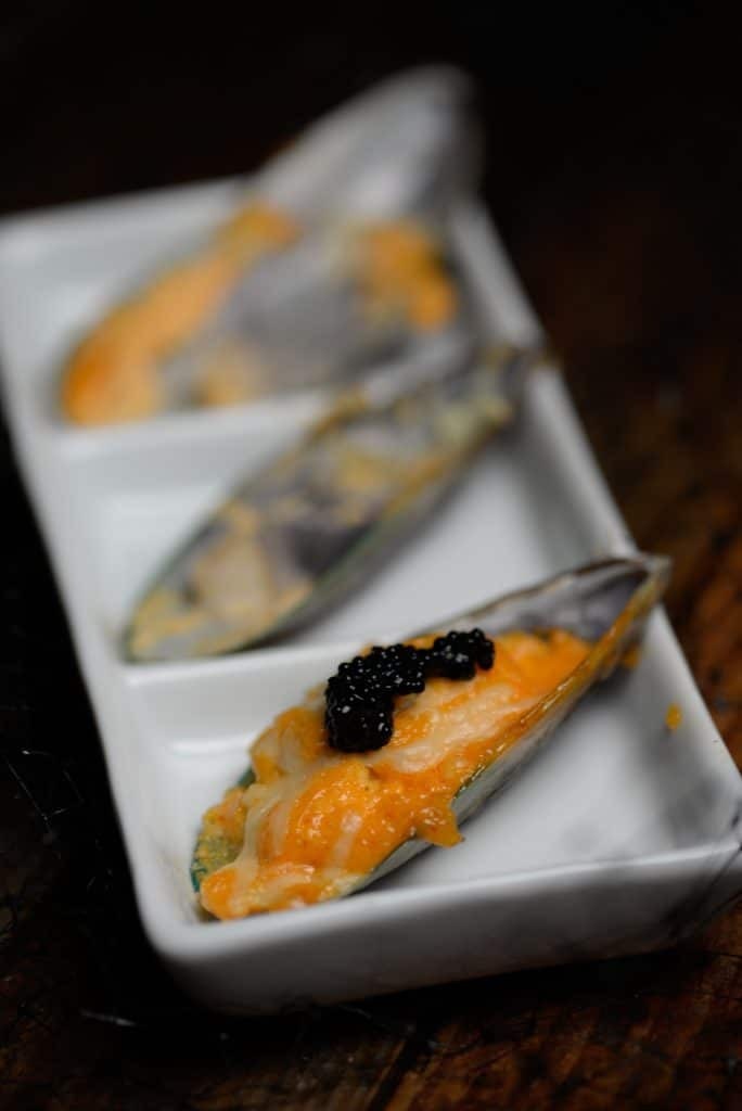 - выложите примерно по чайной ложке соуса на каждую мидию, сверху посыпьте тертым пармезаном