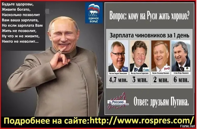 Алексей, Вы - очень злой человек!!! - А в чем выражается моя злость? Я просто констатирую факты, как известно, факт вещь упрямая, а правда очень часто горькая. Ты вот сидишь и думаешь, что злые америкосы у тебя на шее сидят, пригляделась, ан нет, это свои родные, яхты с виллами на западе скупают, причем на "честно заработанную" зарплату. И вот у тебя возникает вопрос, почему у тебя проблема, что суп жидковат, а у них проблема, жемчуг мелковатый.