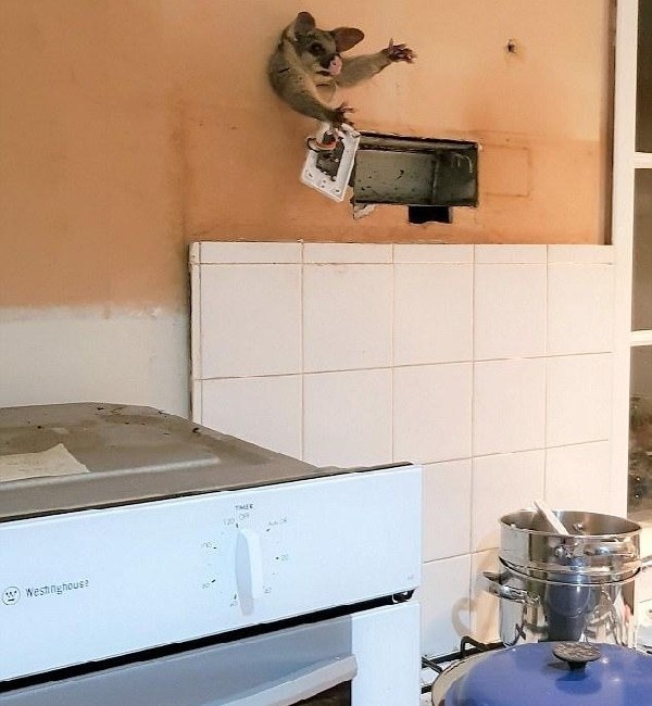 Животное залезло на кухню одного из многочисленных домов Мельбурна, где мирно спали люди. Поссум хотел незаметно стащить какой-нибудь лакомый кусочек и отправиться восвояси, но не рассчитал свои гобориты тела и… застрял в стене.