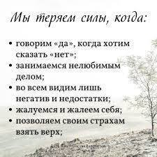 1. Когда мы хотим сказать "нет", мы говорим "да". 2. Чтобы мы улыбались, а не плакали. 3. Мы не отдыхаем. 4. Мы убеждаем себя потерпеть еще немного, вместо того чтобы осознать благую цель, ради которой мы терпим что-то сейчас. 5. Мы оскорбляемся вместо того, чтобы попросить другого человека о том, что нам нужно 6. Делать то, что нас не касается. 7. человек не заинтересован, но мы продолжаем взаимодействовать с ним по какой-то воображаемой причине. 8. что мы окружаем себя людьми, которые большую часть времени говорят негативно. 9. Мы много говорим о политике, счетах, пробках и т.д. 10. мы сплетничаем. 11. Мы много говорим об образе жизни других людей. 12. работать на неинтересной и скучной работе. 13. Мы боимся. 14. Мы ждем, что кто-то придет (Санта-Клаус, принц, олигарх Леопольд) и жизнь изменится. 15. Мы виним себя, считаем себя недостойными, некомпетентными, неудачниками. Когда мы обретаем силу.1. Знакомиться с новыми людьми. 2. Приобретать новые навыки. 3. Путешествие. 4. Преодолеть наши страхи. 5. Пробовать новые вещи. 6. Ходьба (не путать с "спешить на работу" или идти в магазин, а ходить без определенной цели). 7. Делать что-то творческое. 8. Общаться с хорошими людьми. 9. Общайтесь с людьми, которые поддерживают вас и верят в вас. 10. Физические упражнения (подойдут любые упражнения, сауна, бассейн). 11. Освобождение физического пространства (вспомните, как по-другому мы чувствуем себя в отремонтированной комнате) 12. Освободить эмоциональное пространство (вспомните, насколько по-другому вы себя чувствуете, когда вам удается кого-то простить и с кем-то попрощаться). 13. Говорите "нет", когда хотите сказать "нет", и "да", когда хотите сказать "да". Начать делать то, что мы хотим делать.