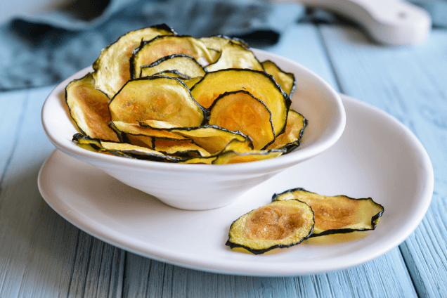 Кабачок (1 шт.) нарежьте очень тонкими кружочками. Молодые овощи практически без семечек — самый лучший вариант. Присыпьте кружочки солью, перцем, паприкой или любимыми приправами, сбрызните оливковым маслом. В духовке такие чипсы необходимо выпекать 40–60 минут при температуре 100°, предварительно застелив противень пергаментной бумагой. В сушилке — несколько часов. Насладиться хрустом можно сразу после остывания.