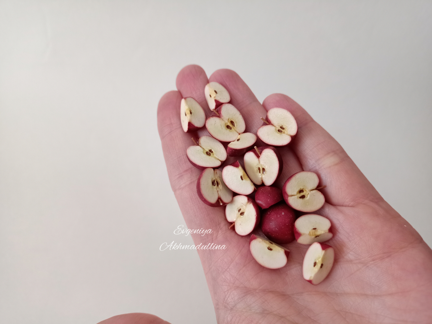 На самом деле яблоки на видео выполнены из запекаемой полимерной глины. Мне очень нравится с ней работать, нравится ее послушность.
