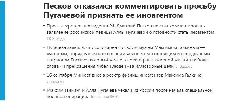 После известных событий - Признание Минюстом Галкина*** иноагентом и требования Пугачевой признать и ее иноагентом - общество просто сошло с ума. Заслуги поистине Народной певицы уже не в счет. Весь ее талант, вся ее жизнь и творчество общество готово "обнулить" без сомнений и колебаний.