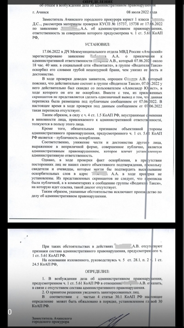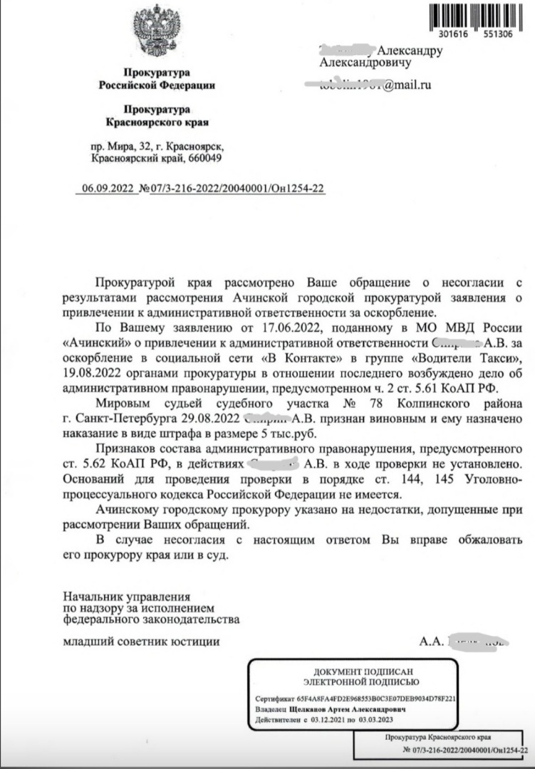 Изначально прокуратура не усмотрела состав деяния, однако, это явилось поводом оспорить постановление об отказе в возбуждении дела, а так же отдельной жалобой на халатность исполнения должностных обязательств надзорного органа.
