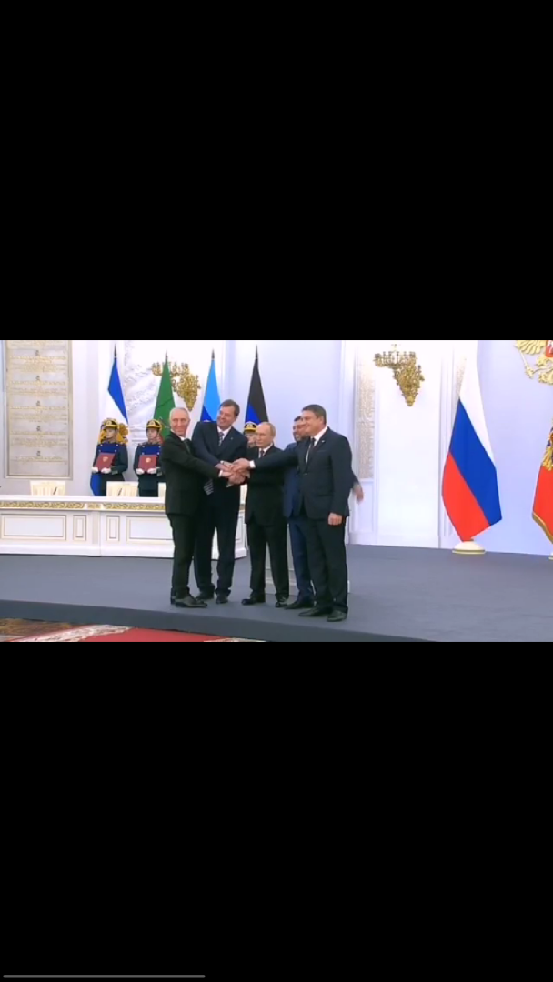 На фотографиях президент России Владимир Путин и главы Херсонской и Запорожской областей Владимир Сальдо и Евгений Балицкий, а также главы ДНР и ЛНР Денис Пушилин и Леонид Пасечник сразу после подписания договоров в Московском Кремле.