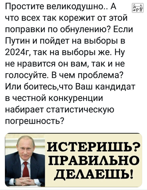 Если видите нарвались на чрезмерное минусование, то или просто примите позицию, что это не ВЦИОМ, и тут нет тех 80 %, кто доверяет и поддерживает, здесь много не одобряет (мягко сказал). Не хотите нарастания "гнева"-не стоит продолжать. Поняли, не поняли, согласны-не согласны. Потом никто не будет разбираться. Я реально побаиваюсь, что как бы эти разногласия сейчас в жаркое время не привели к еще более нехорошему.....