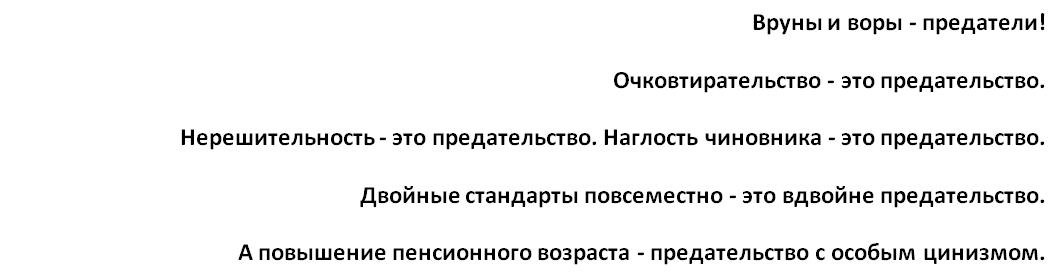 Нет! Я не защищаю предателей. Да! Я тоже считаю отъезжающих предателями! Но также предателями я считаю врунов и воров. Очковтирательство - это предательство. Нерешительность - это предательство. Наглость чиновника - это тоже предательство. Двойные стандарты повсеместно - это вдвойне предательство. А повышение пенсионного возраста - предательство с особым цинизмом.