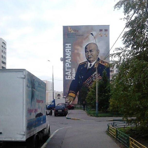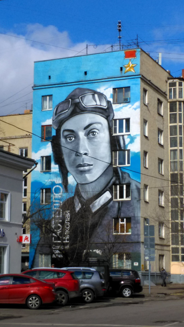 "Дом с портретом летчика, в честь которого названа улица. Графический портрет героя войны появился в 2015 году на торце дома в рамках совместного проекта Департамента культуры города Москвы и Российского военно-исторического общества (РВИО), посвященного 70-летию Победы в Великой Отечественной войне."
