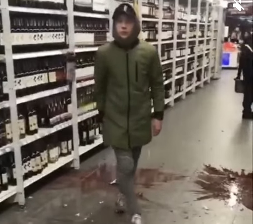 Ребята зашли в первый супермаркет, закрыли двери и один из них начал раскидывать бутылки с вином на глазах покупателей, которые были напуганы их поведением, не понимая всю суть происходящего.