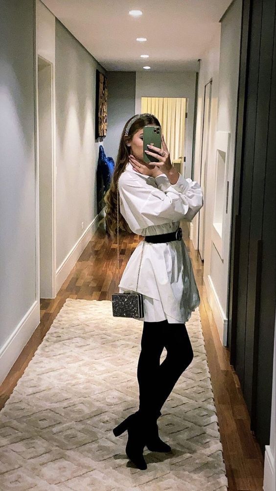3. Рубашка и колготки – ищете этот повседневный, но буджевый образ? Этот стиль хорошо сочетается с каблуками, балетками или туфлями.