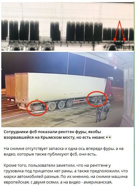 ФСБ тут же в прыжке переобулась, назвав своё прежнее заявление фейком, мол, рентгеновский снимок сделан и вовсе даже не на Крымском мосту, а на российско-армянской границе, потому и машины менялись. Преимущество "вранья с колёс" - возможность опровергать себя не моргнув глазом.