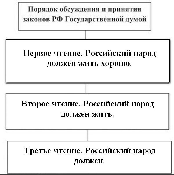 Вот мне и не понять для чего нам нужна Гос. Дума. ... Президент или остальные перечисленные задачу поставили, Профильное Министерство проект подготовило, Мин. Юст Проект одобрил и на подпись к Президенту Премьер представил. Остальные-то зачем?... Какой % Народа состоит в Партиях? НАВЕРНОЕ максимум % 2, а то и меньше. И эти 2% от Народа даже за один раз прочитать не могут, им 3 раза надо прочитать ... Что к чему?! ...При чём сразу отпадет надобность в Постановлениях Правительства на каждый ФЗ