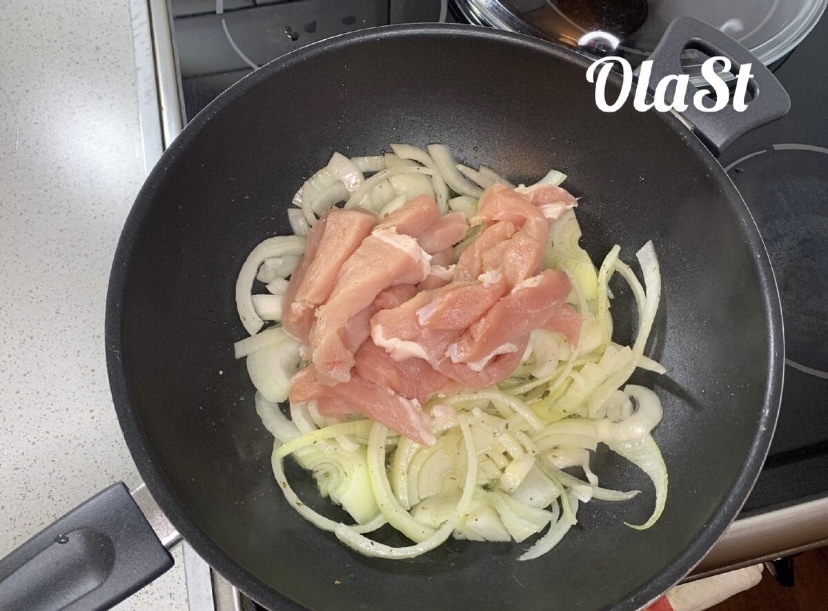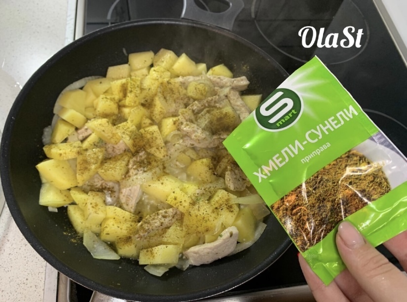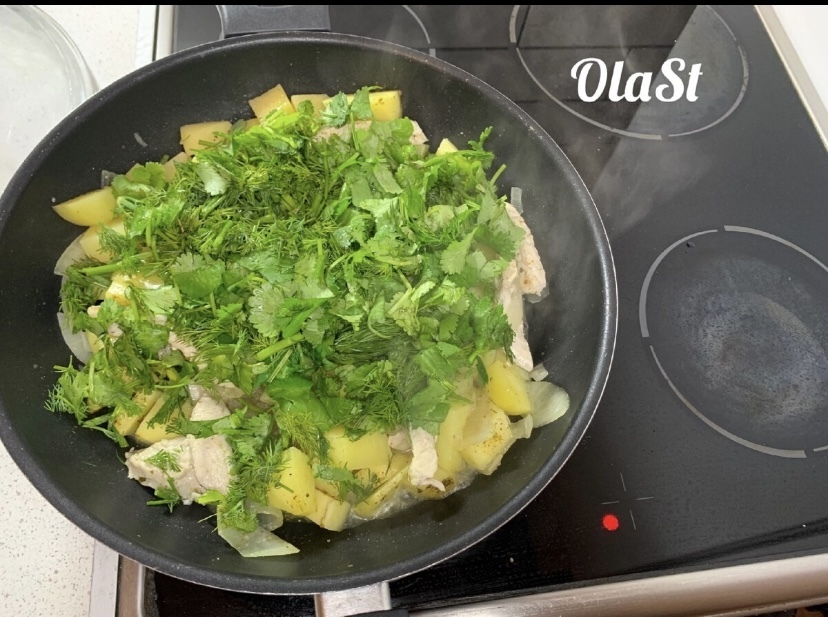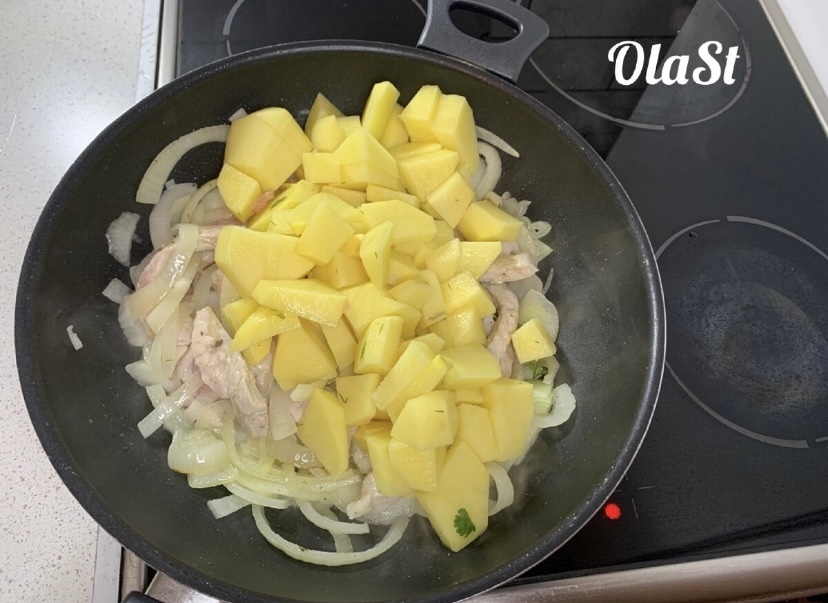 Добавляем порезанную кубиками картошку, добавляем 30 мл воды и накрываем крышкой.