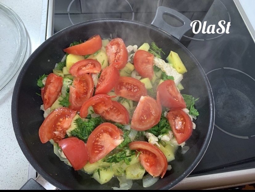 Нарезаем 2 помидора выкладываем сверху ингридиетнов и накрываем крышкой.