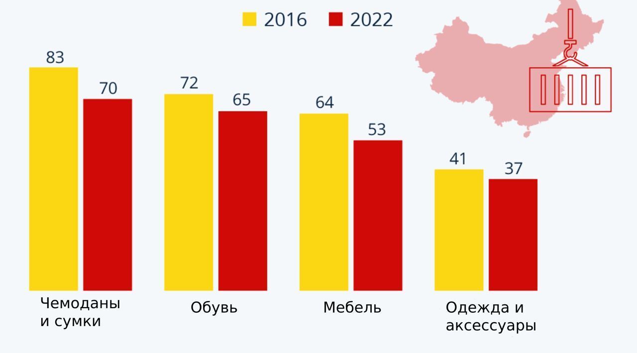 ⚠️ В период с 2016 по 2022 гг. доля Китая в мировом экспорте обуви и мебели снизилась на 7% и 11% соответственно. Падение экспорта в категории чемоданов и сумок было еще больше - 13%, но Китай продолжает доминировать в этом сегменте. В стране наблюдалось меньшее падение экспорта в важной категории одежды и аксессуаров, но тут доля экспорта была меньше всего с самого начала.