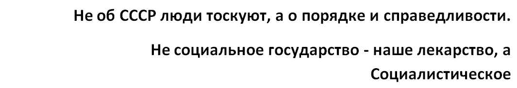 Социализм и Плановое хозяйство. И даже не СССР, за темой которого скрывается истинная ностальгия о политическом строе. Не об СССР люди тоскуют, а о порядке и справедливости. Не социальное государство - наше лекарство, а Социалистическое. Даже вместе со своими недостатками.