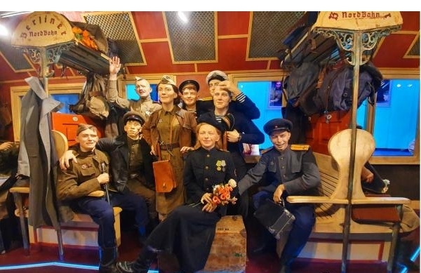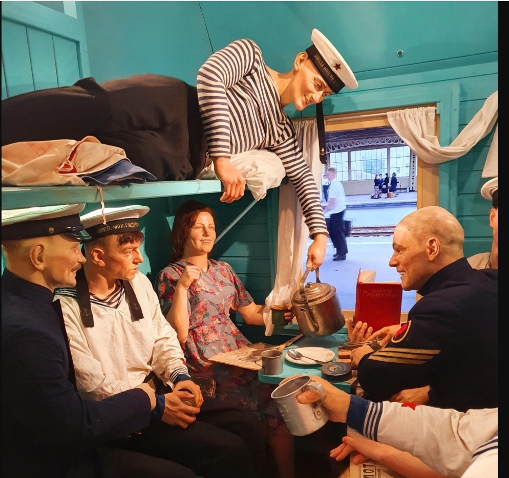 Экскурсия начинается с вагона, который показывет нам довоенную жизнь. Девушка отправляется в свой первый рейс, в вагоне весело и шумно, все счастливы.