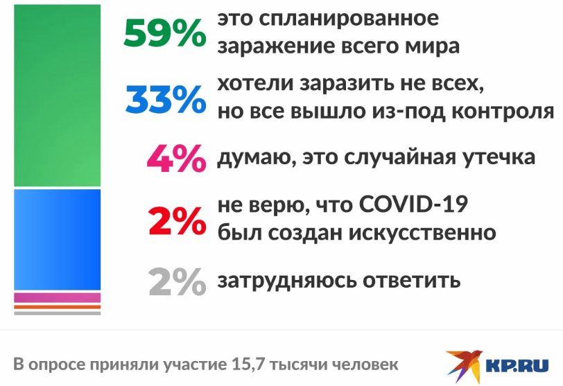 Вообщем, 92% опрошенных полностью уверены, что коронавирус создан искусственно.