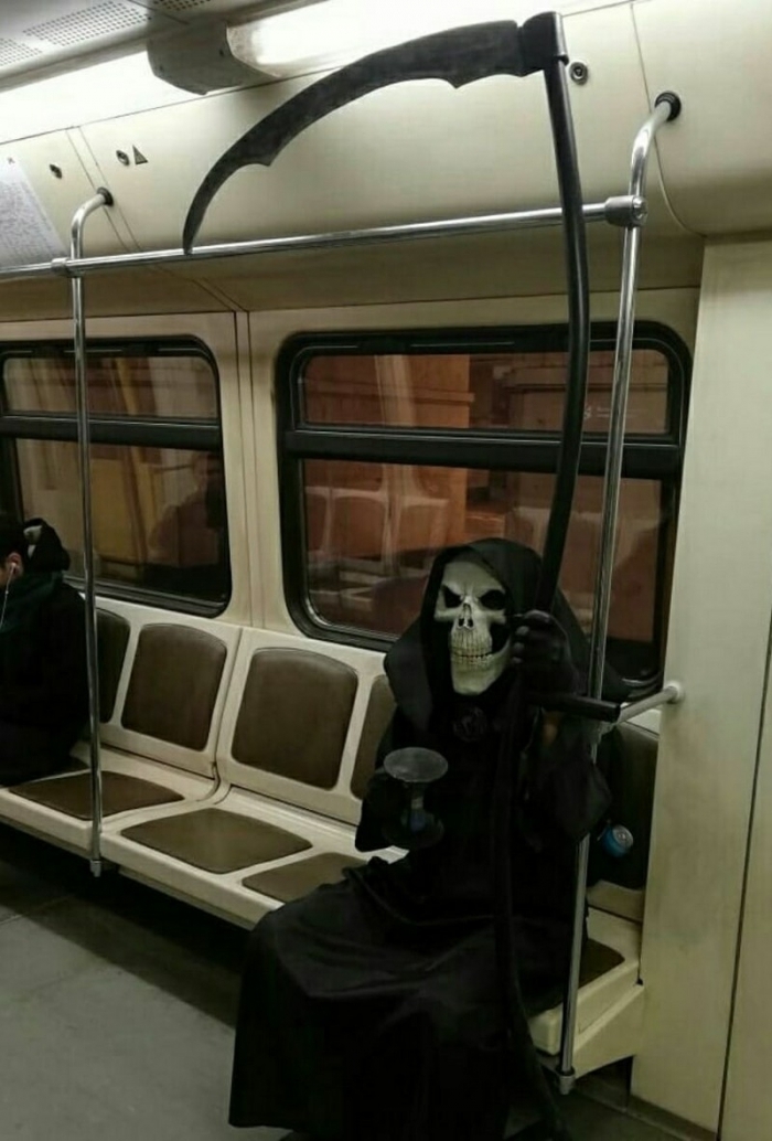 Когда зайдя в вагон, а перед тобой сидит смерть, я думаю реакция будет не смех, а пук. Интуитивно захочется покинуть вагон, а кто - то ведь на работу спешит, неважно кто та мсидит, человек в костюме или