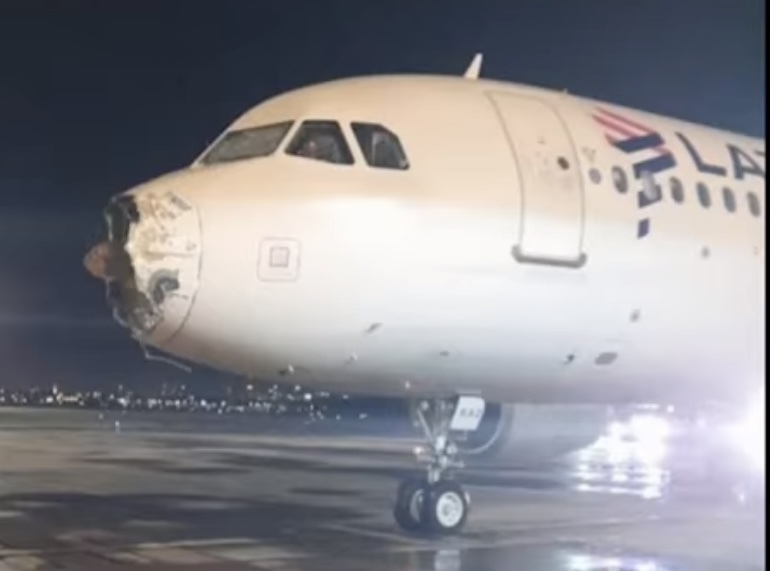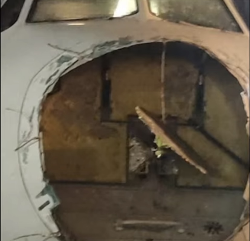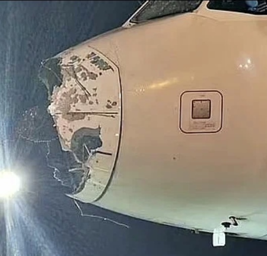 Сила природной стихии была настолько сильна, что самолёт, находясь в воздухе остался без носа, однако, в этот момент пилоты не растерялись и смогли, благодаря своему опыту избежать трагических последствий и посадить удачно самолёт.