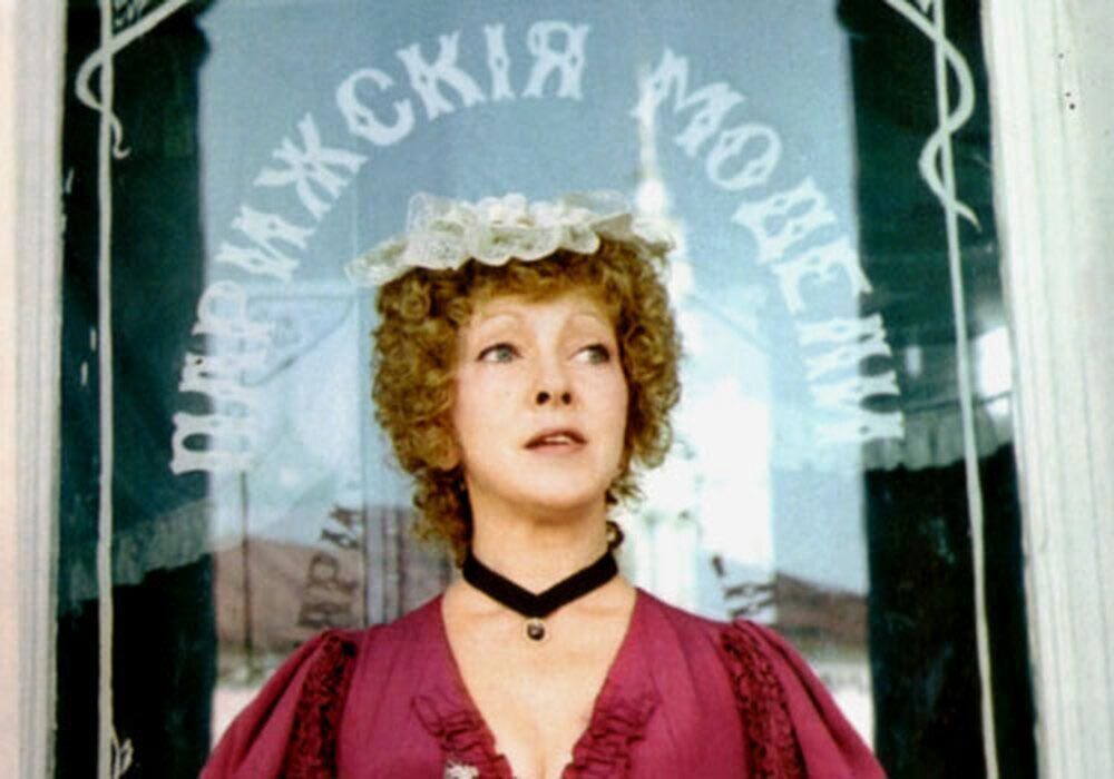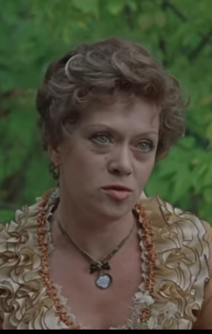 Похожую подвеску носит модистка, только лента не светлая, а чёрная. Модистку сыграла Ольга Волкова - бабушка из "Папиных дочек". Именно с ней Карандышев торговался из-за платья.